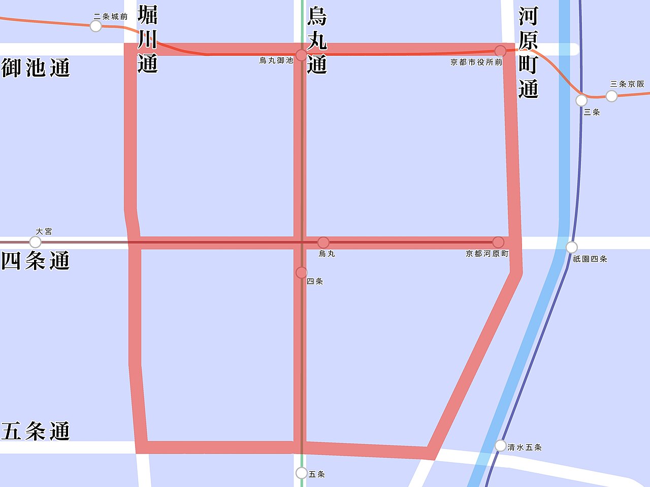 下京区と中京区にはいわゆる「田の字地区」と呼ばれるエリアがあり、このエリアには建物の高さ制限があります。北は御池通、南は五条通、東は河原町通、西は堀川通までです。