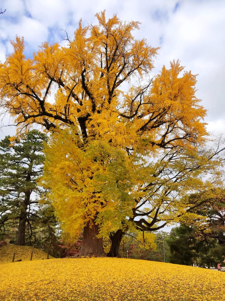 このイチョウは、京都市の「区民誇りの木」にも選ばれている樹齢の古い巨木であり、例年11月中旬から下旬にかけて、苑内でも圧倒的な黄金色の姿を誇ります。