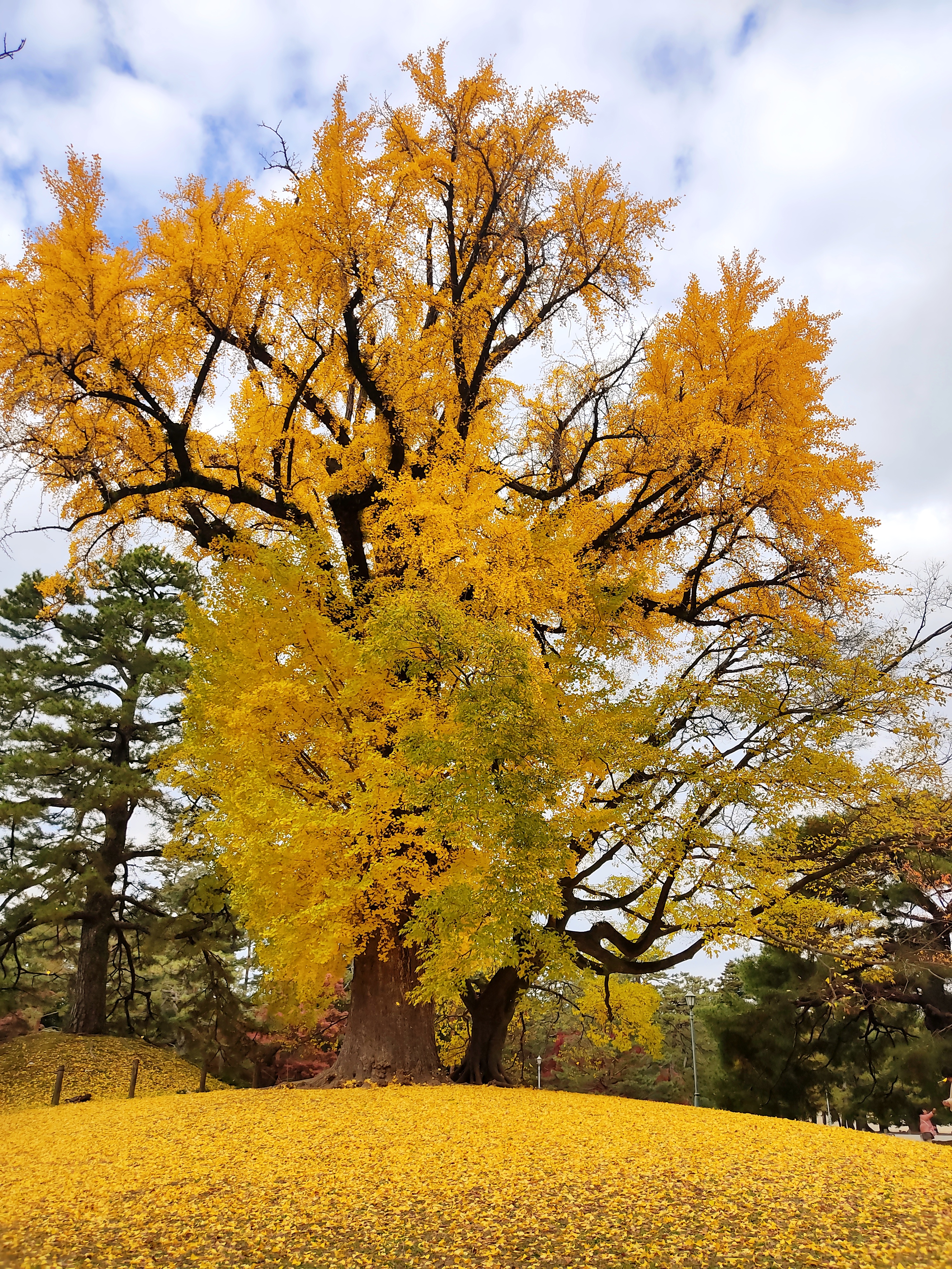落葉が進むと、イチョウの根元一帯が「黄金色の絨毯」になります。絨毯の上は京都市民の憩いの場になり、それをイチョウが静かに見守っています。